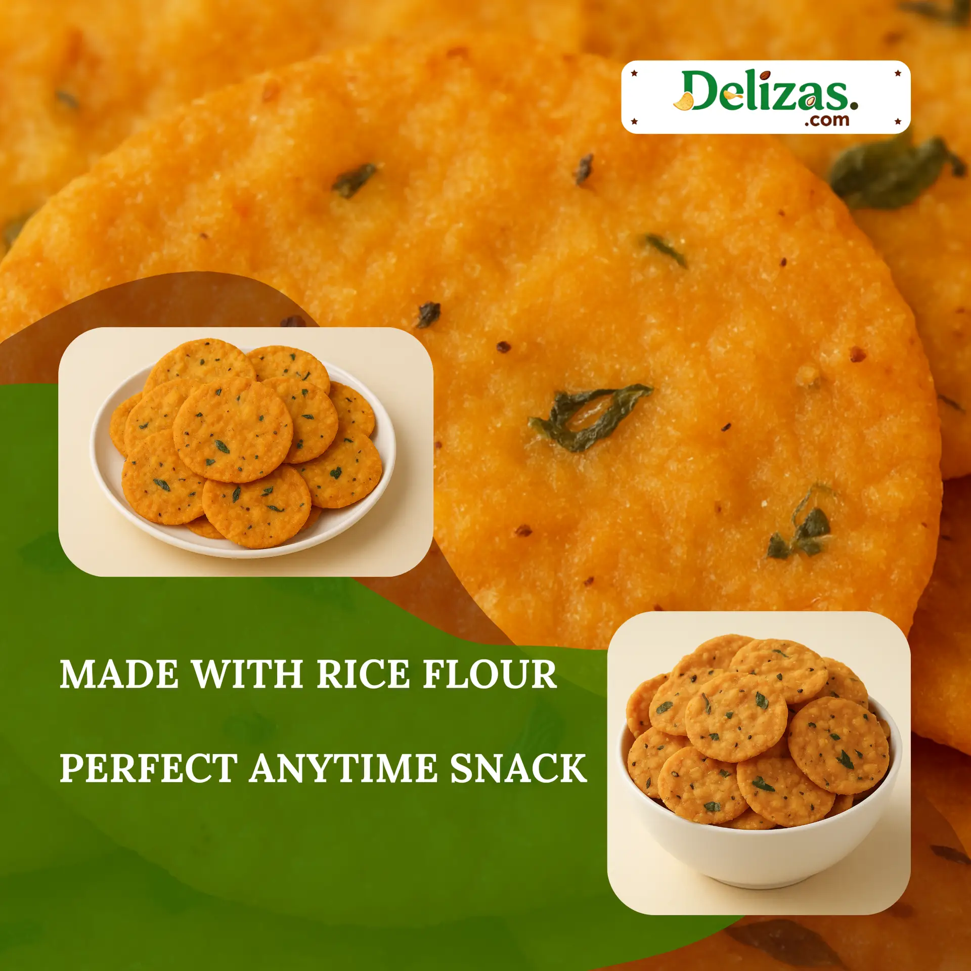 Chekkalu, also known as Thattai or Rice Crackers, is one of South India’s most loved traditional snacks. At Delizas, we prepare Chekkalu using a classic recipe passed down through generations—combining rice flour, roasted gram, butter, curry leaves, ginger, and mild spices to create a flavour-packed, crunchy delight.